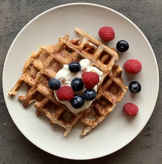 Białko ubiłam na sztywno. Dodałam żółtko i pozostałe składniki i wymieszałam mikserem. Wylałam na rozgrzaną gofrownicę i piekłam dosłownie 3-4 minuty.