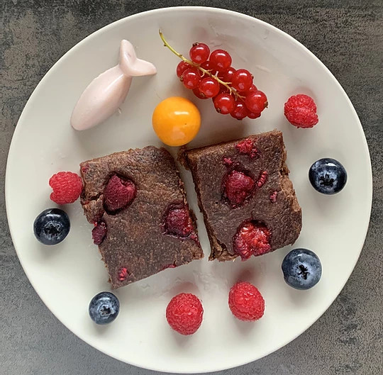 Wszystkie składniki zblendowałam na gładką masę i wylałam do okrągłego naczynia (20 cm) wyłożonego papierem. Wierzch posypałam malinami. Piekłam ok 30 min w 180 stopniach. Pycha!