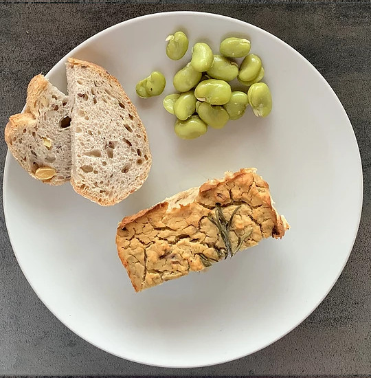 Cebulę zeszklić na oliwie. Dodać gruszkę i chwile podsmażyć. Fasolę odcedzić i przełożyć do misy blendera. Dodać jajko lub mielony len, cebule i gruszkę i zblendować na gładką masę. Dodać przyprawy i wymieszać. Na dnie keksówki wyłożonej papierem do pieczenia wysypać orzechy. Na to wylać masę, a na wierzchu położyć gałązkę świeżego rozmarynu. Piec w 180 stopniach przez ok 50 min. Podałam z bobem i chlebem.