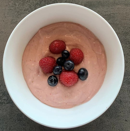 Wszystkie składniki zblendować na gładką masę. Przełożyć do miseczki i udekorować ulubionymi owocami.