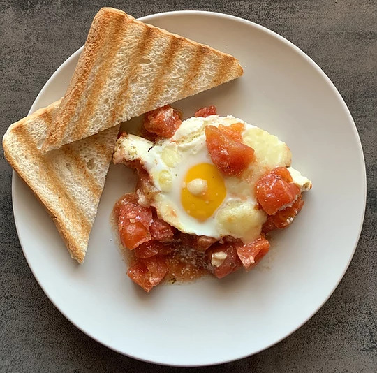 Niewielkie naczynie żaroodporne (u mnie takie 15 x 20 cm) wysmarować dość grubo masłem. Do naczynia wlać pomidory, wsypać przyprawę, wymieszać i równomiernie rozprowadzić je w naczyniu. Do pomidorów wbić obok siebie dwa jajka (pilnować, by żółtka się nie rozlały) i posypać serem. Piec w 180 stopniach (góra-dół) przez 25 min.