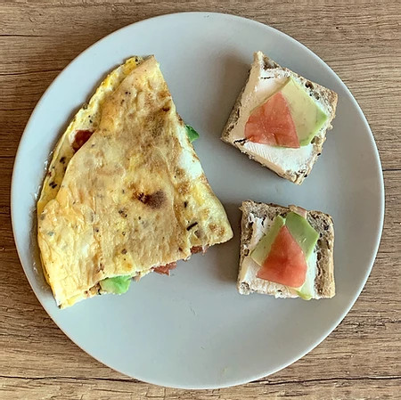 Pomidora i awokado pokroić w kostkę. Jajka wymieszać z ziołami, wylać na patelnię z rozpuszczoną odrobiną masła i na wierzch dodać warzywa. Przykryć pokrywką. Gdy omlet się zetnie przewrócić na druga stronę.
