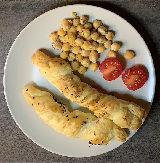 Przygotowanie jest banalnie proste. Wycinacie wąskie prostokąty, kładziecie na nie dowolny dodatek, posypujecie ziołami prowansalskimi i zawijacie w takie zakręcone paluszki. Ja na wierzchu posmarowałam je jajkiem i posypałam czarnuszką.