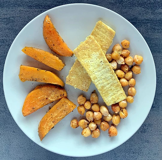 Tofu, bataty i ciecierzycę piekłam razem na jednej blasze w 180 stopniach przez ok 30 min.