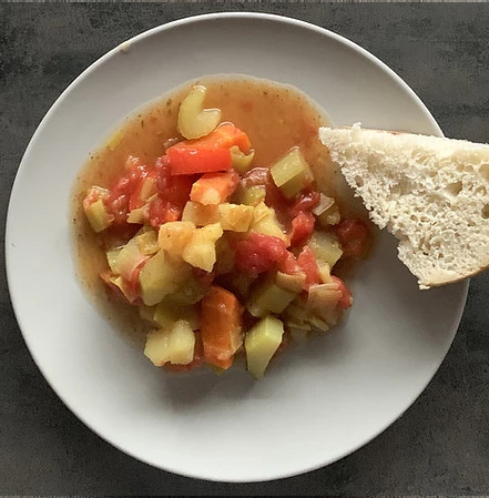 Wszystkie warzywa pokroić w kostkę. Do garnka przełożyć ziemniaki i marchewkę. Zalać połową szklanki wody. Gotować pod przykryciem ok 10 min. Po tym czasie dodać paprykę i selera. Dusić kolejne 5 min. Następnie dodać cukinię, pomidory i pora i gotować kolejne 10 min. Na koniec przyprawić.