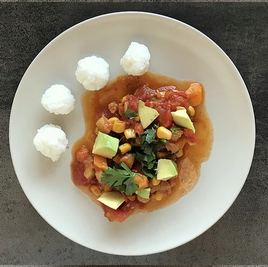 Cebulę zeszklić, dodać pokrojona w kostkę marchewkę i przyprawy. Dolać ok 200 ml wody i dusić pod przykryciem. Po ok 10 min dodać paprykę i cukinie i dusić kolejne 10 min. Dodać pomidory, dusić jeszcze chwilkę. Doprawić do smaku. Po wyłożeniu na talerz wymieszać z pokrojonym w kostkę awokado i posypać natką pietruszki. Ja podałam z kulkami ryżowymi.