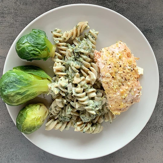 W międzyczasie w garnuszku zeszkliłam cebule z czosnkiem. Dodałam szpinak i dusiłam przez 5 min. Dodałam przyprawy, śmietanę i jogurt. Gotowałam jeszcze chwile. Podałam z makaronem pełnoziarnistym.