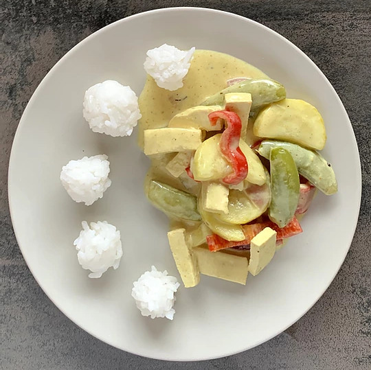 Curry wsypać na głęboka patelnie i dodać łyżeczkę oleju kokosowego. Dodać liście kafiru i chwile smażyć. Po tym czasie dodać pokrojone warzywa, tofu i wlać mleczko kokosowe. Doprawić i przykryć pokrywką. Warzywa i tofu powinny gotować się w mleczku przez ok 15-20 min. Podawać z ryżem.