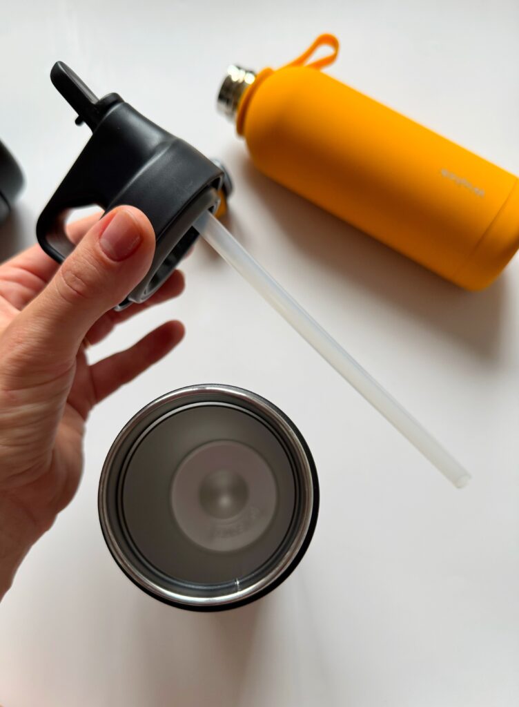 Ten bidon jest chyba najtwardszy ze wszystkich trzech. Wojtek nosi go w plecaku, czasem się zdarza, że butelka ląduje na ławce albo upada – ADV wytrzymuje naprawdę sporo: lakier trzyma się dobrze (pomimo zarysowań podczas przenoszenia), a ustnik ze słomką działa tak, że Wojtek może się napić bez przechylania głowy. Bardzo doceniam, że zamknięcie jest szczelne – żadna ciecz nie przeciekła, nawet gdy butelka stała luzem w plecaku. Do tego naprawdę daje radę z temperaturą: zimna woda była chłodna przez kilka godzin.